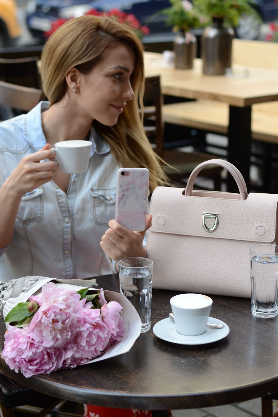 I love comfy boho outfits like this one! When I saw the red floral pants I instantly fall in love. I paired them with white denim shirt that I thought it was most neutral, and the cutest pale pink slippers that are the hotest 2017 trend! I adore my Dior Diorama bag and these shoes are the petfect match!
