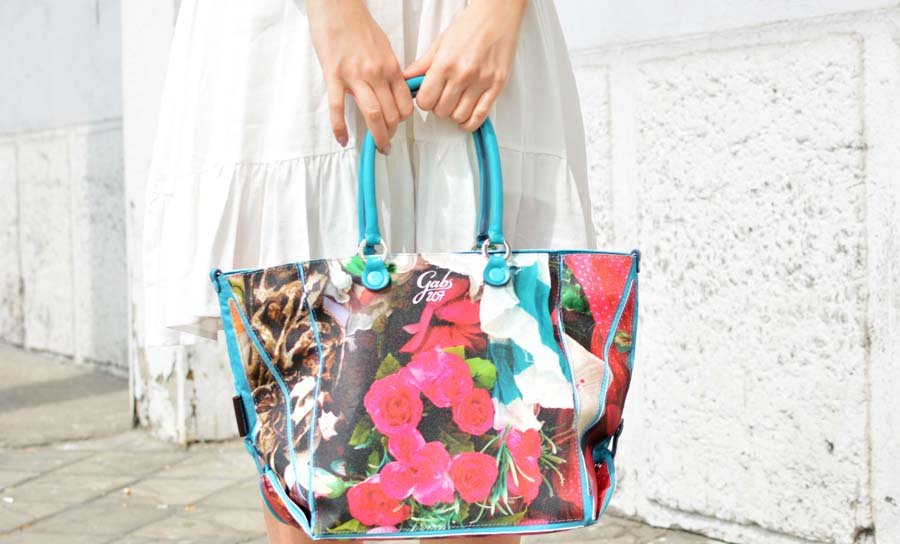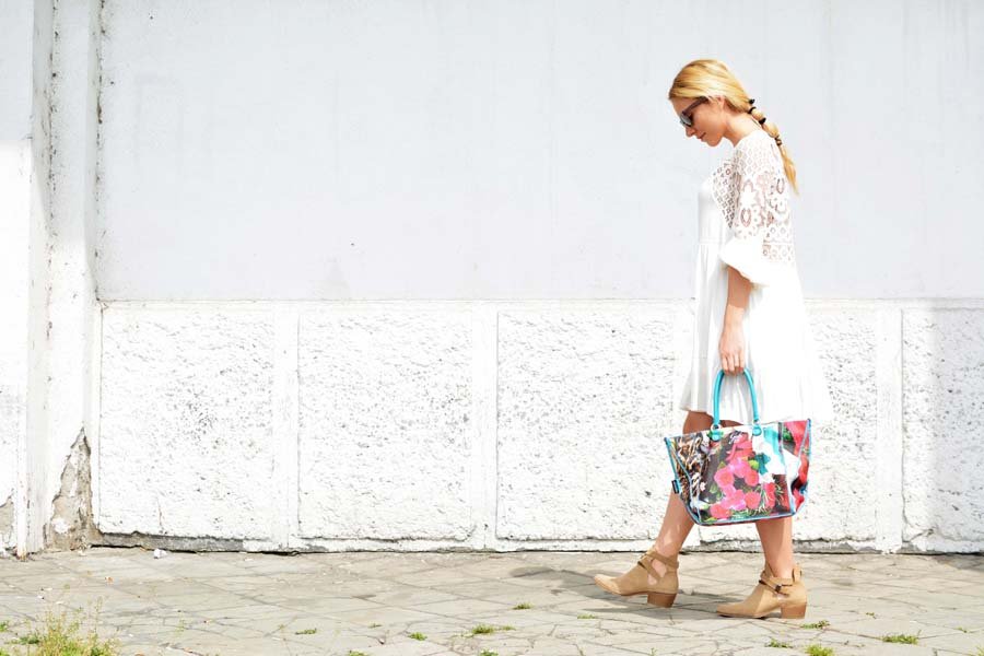 For spring and summer I always opt for a brighter outfit colors, and white is the eternal inspiration. This fluttering dresses in boho style is a fantastic fit with booties and it is a piece of clothing that is ideal for warmer days. With bright and neutral colors, I decided to wear a colorful Gabs bag with details, as the most striking detail.